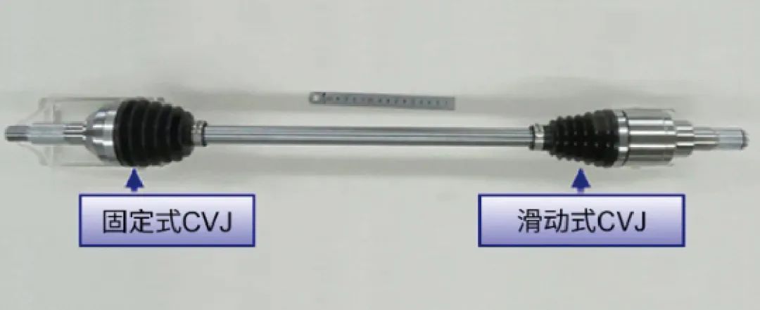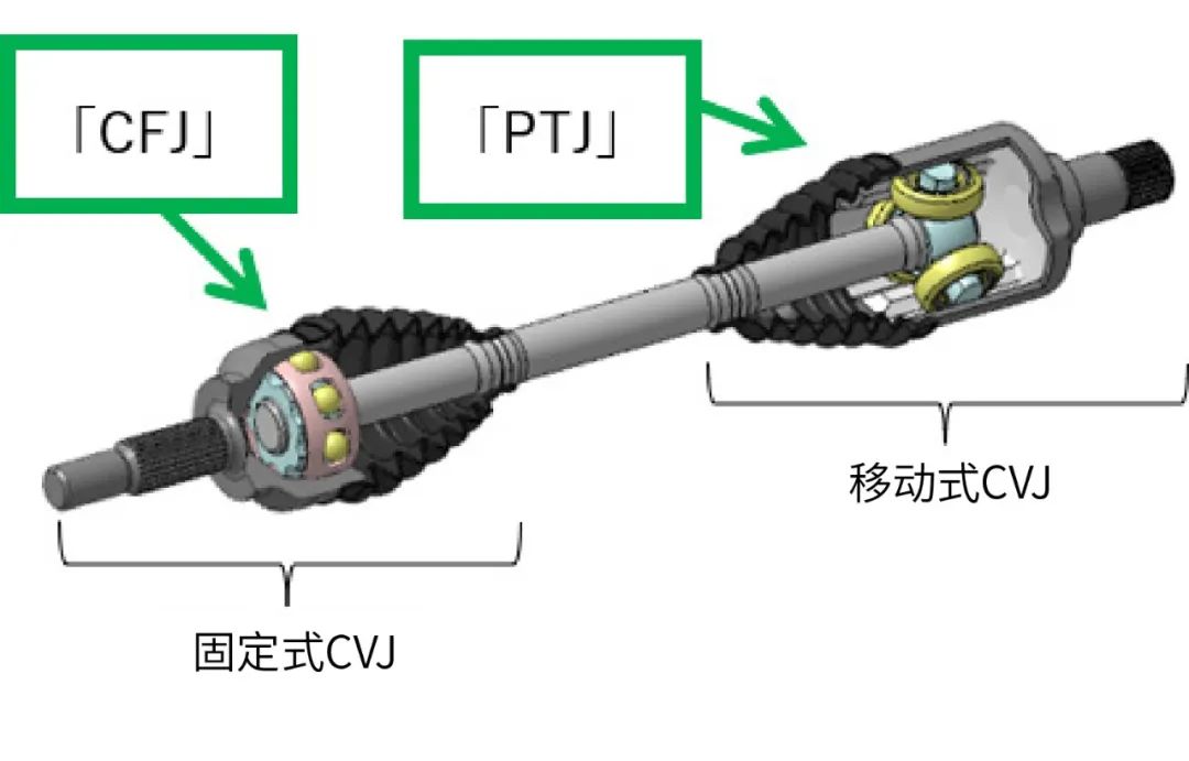 驅(qū)動(dòng)軸是一個(gè)將電機(jī)或其他動(dòng)力傳動(dòng)單元的動(dòng)力(扭矩)傳遞到輪胎的部件。它由一個(gè)輪胎側(cè)的固定式等速萬(wàn)向節(jié)(CVJ)、一個(gè)動(dòng)力傳動(dòng)側(cè)的移動(dòng)式等速萬(wàn)向節(jié)(CVJ)以及連接這兩個(gè)CVJ的軸組成。