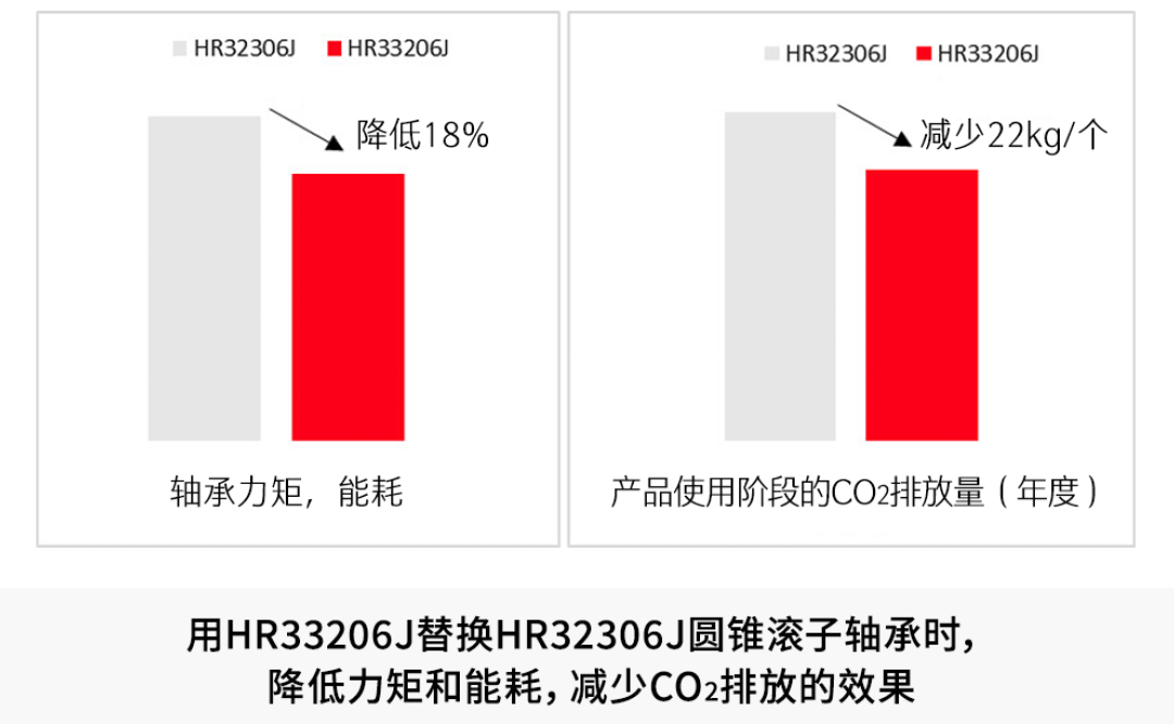 例:圓錐滾子軸承HR32306J可用較小的HR33206J代替。據估計,更換后軸承力矩和能耗可降低約18%,在產品使用階段每年可節約電能*4 約48kWh,相當于減少CO2排放量*4 約22kg。