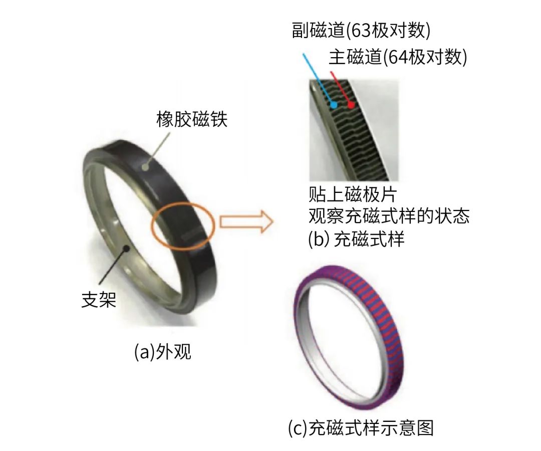 NTN開發的雙列磁環3)如圖4所示,它和磁性傳感器組合使用可用于檢測絕對角度。磁性傳感器的倍增功能和雙列磁環的高精度充磁式樣使其能夠以旋轉1圈(360度)達到10萬等分以上的分辨率進行檢測。由于它是磁力式的,相比光學式傳感器,具有優異的耐污染性能,并且其緊湊的配置有利于節省空間,被用在機器人關節部位或用于各類電機的控制傳感器。