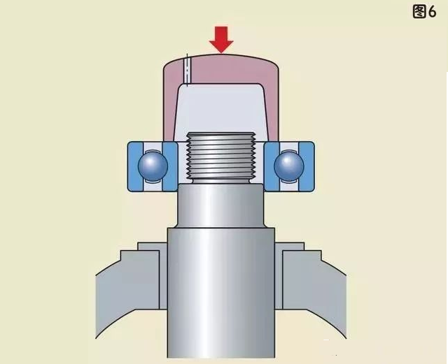 安裝內(nèi)圈過盈配合的軸承時(shí),不能通過外圈和滾動(dòng)體把力傳遞給內(nèi)圈。這會(huì)把軸承滾道和滾動(dòng)體表面敲壞,使軸承在運(yùn)轉(zhuǎn)時(shí)產(chǎn)生噪音并提前損壞。正確的方法應(yīng)該用套筒直接把力作用在內(nèi)圈端面上。